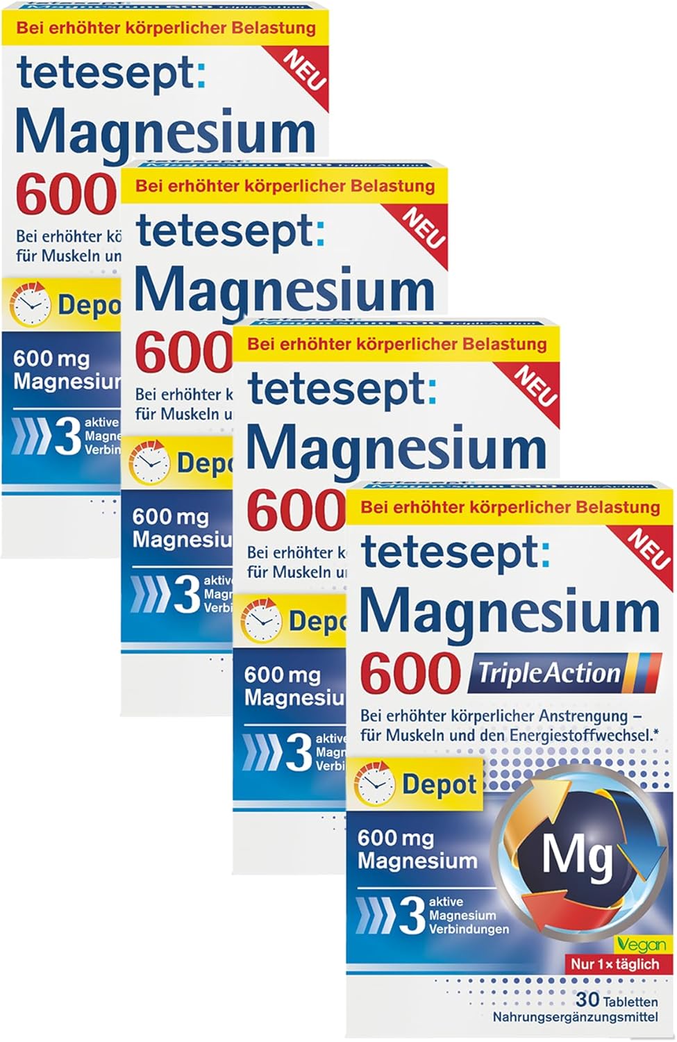 tetesept Magnesium 600 Triple Action Depot – High Dose – Dietary Supplement for Muscles, Nerves and Energy Metabolism – 4 x 30 Tablets