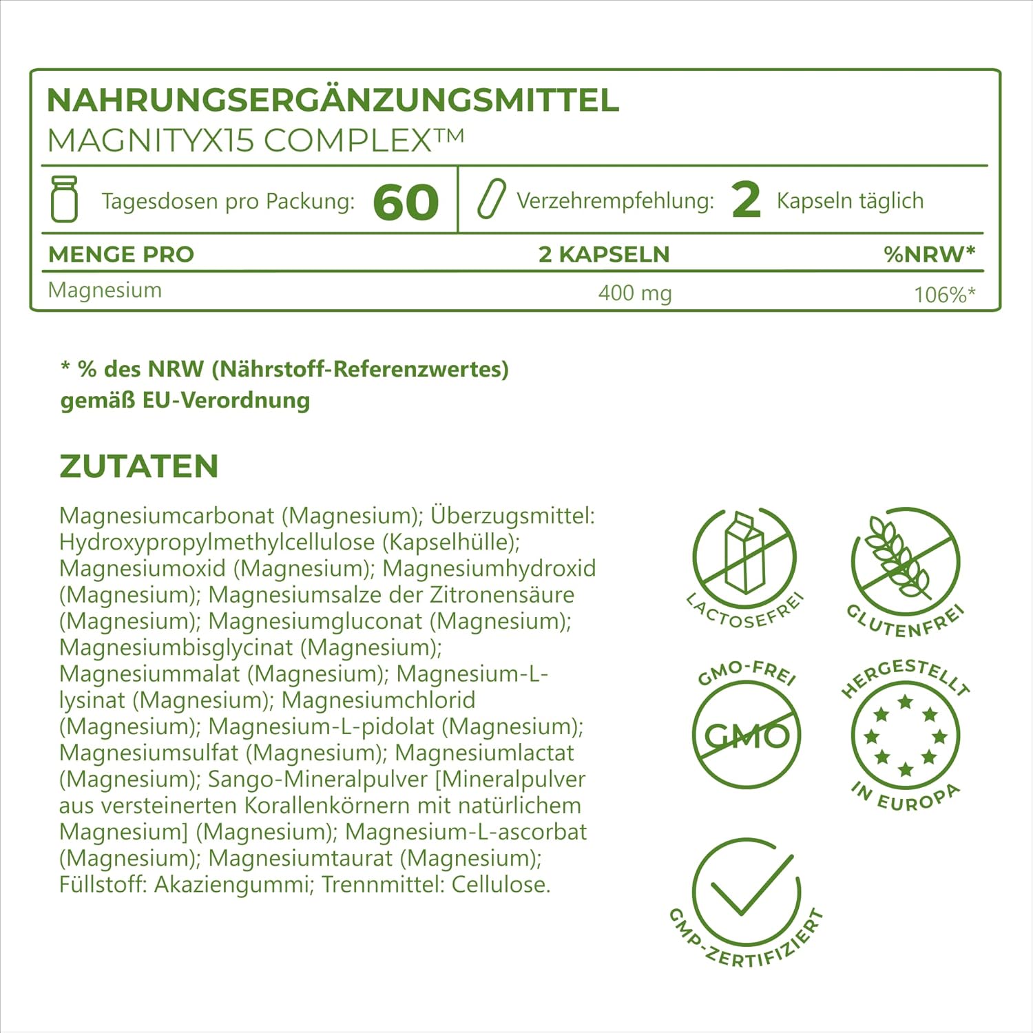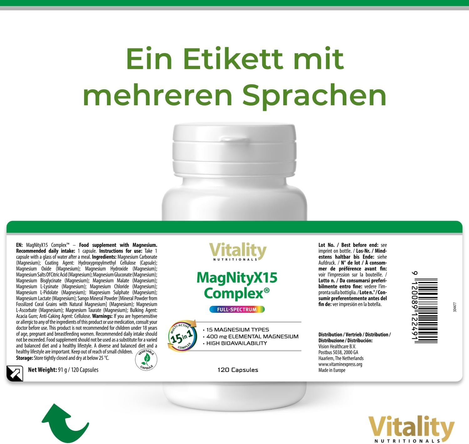 Magnesium Complex MagNityX15 15 Magnesium Compounds Including Magnesium Bisglycinate Citrate & Malate 400 mg per Daily Dose 120 Capsules Muscles Bone Nerves Vitality Nutritionals by Vitamin Express