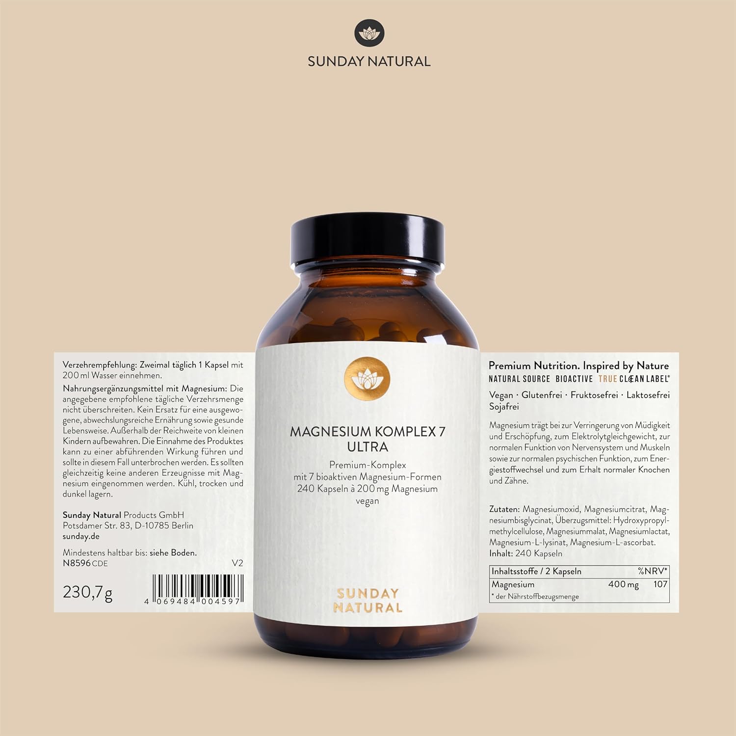 SUNDAY NATURAL Magnesium Complex High Dose – 240 Capsules – 400 mg per Day – Made from 7 Compounds: Magnesium Bisglycinate, Citrate, Malate, Lactate, Ascorbate, Oxide, Lysinate – Vegan, Laboratory