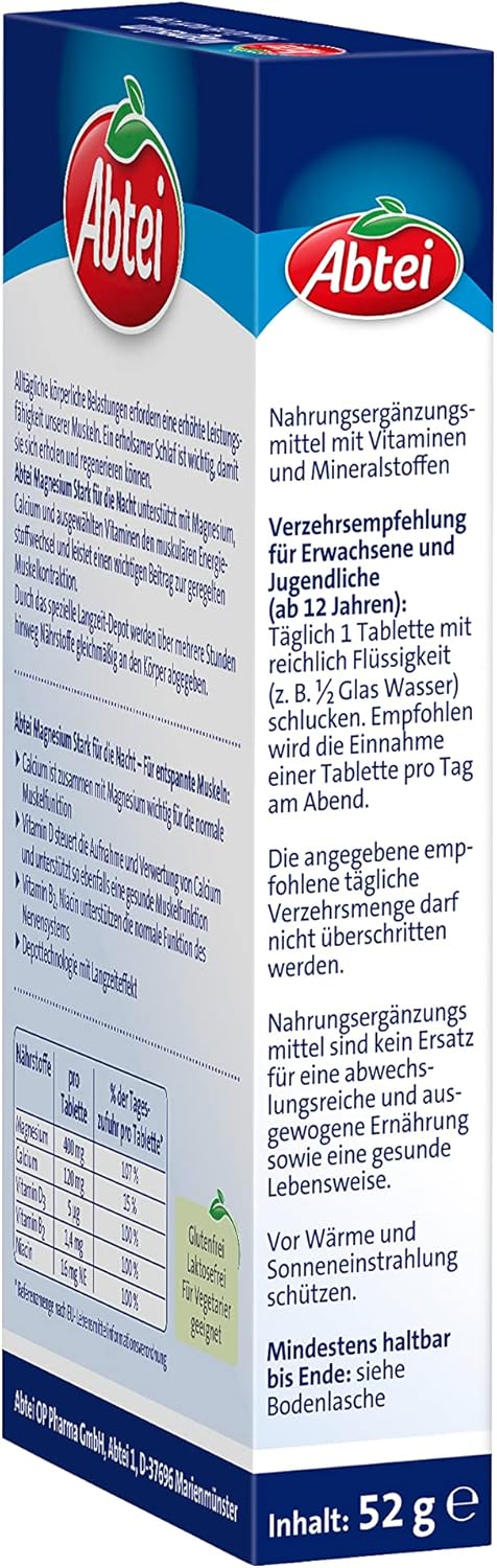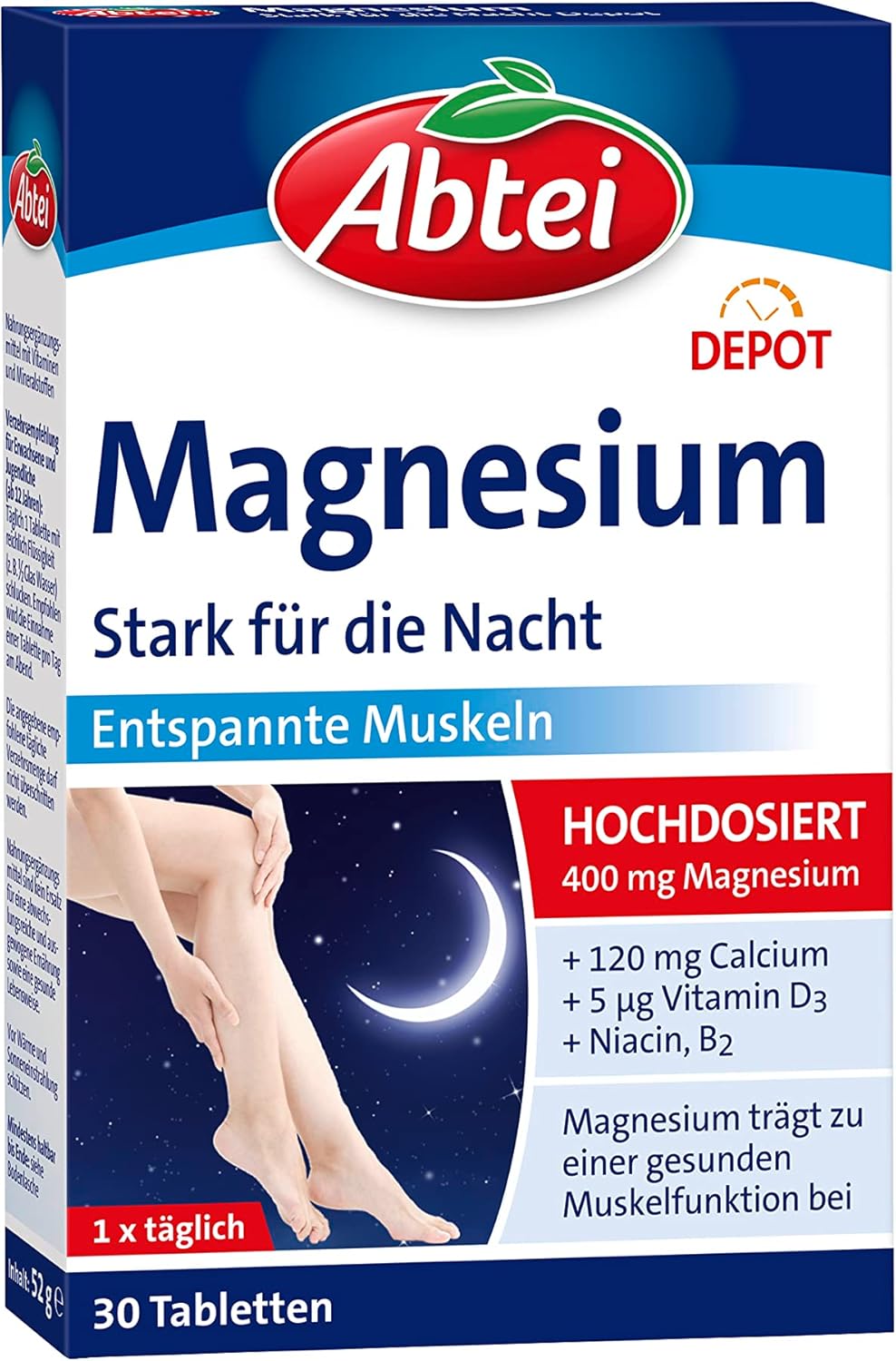 Abtei Magnesium Strong for the Night – for Relaxed Muscles During Sleep – High Dose – Gluten Free, Lactose Free, Suitable for Vegetarians – 30 Tablets