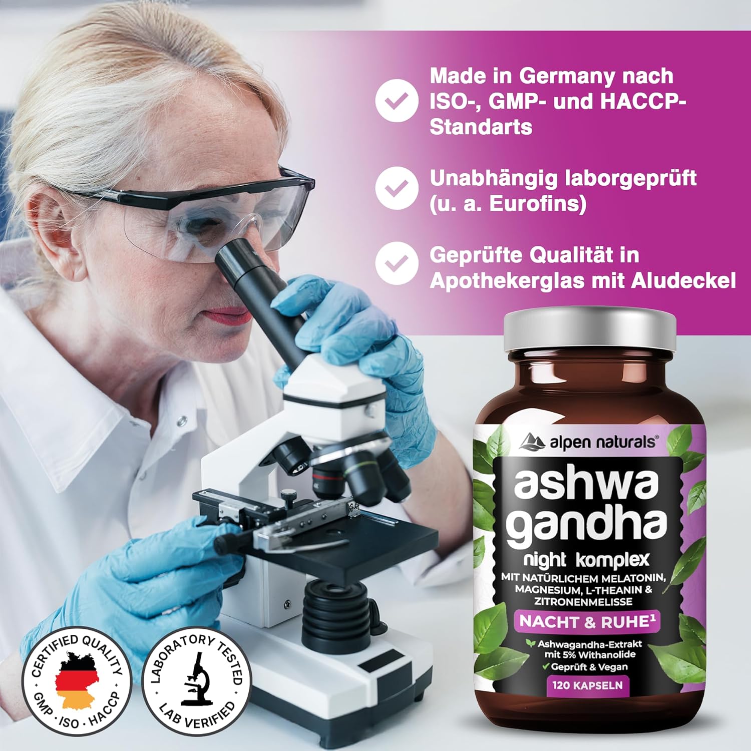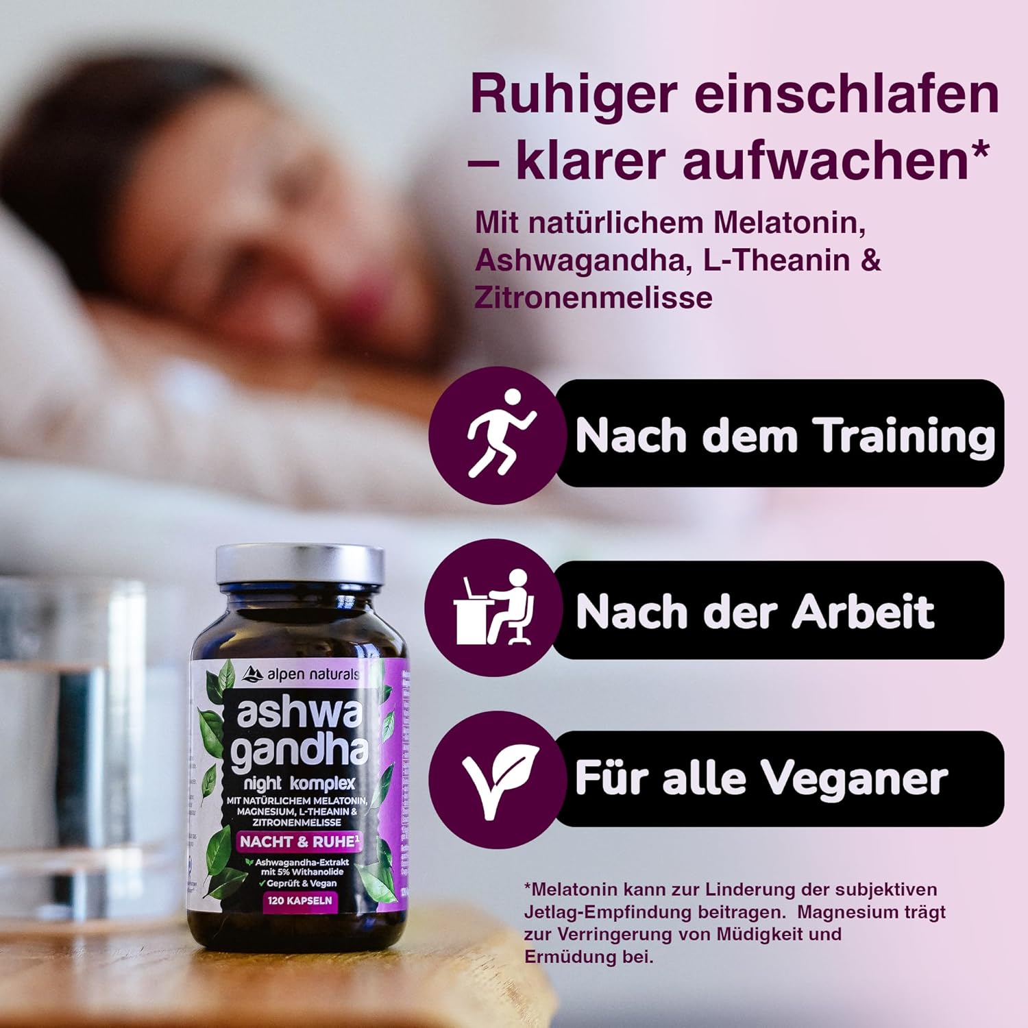 Ashwagandha Complex Night Formula – 120 Capsules with Ashwagandha, Sour Cherry, Magnesium, Lemon Balm & Green Tea – Vegan & Laboratory Tested – Made in Germany