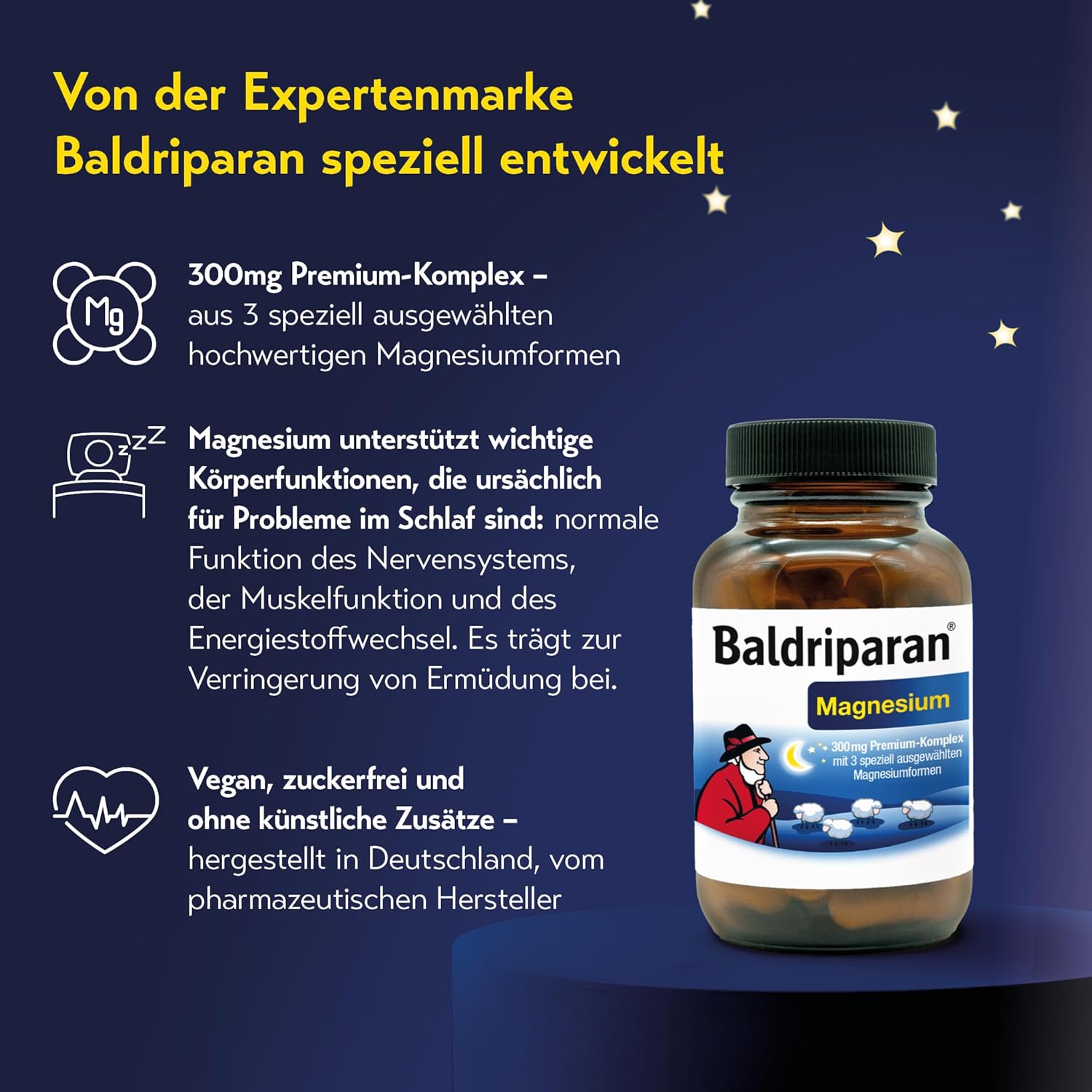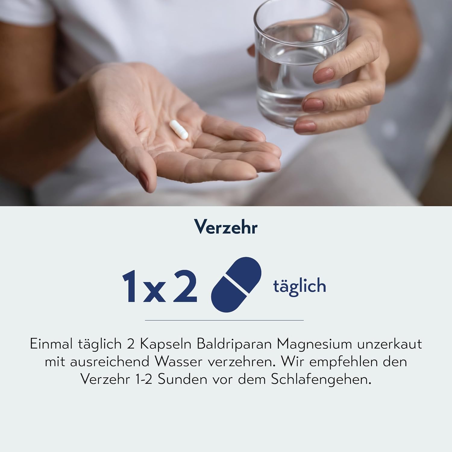 Baldriparan® Magnesium – High Dose Premium Complex with Magnesium Bisglycinate from the No. 1 Pharmacy Plant Sleep Experts. High Bioavailability. Laboratory Tested, High Dosage. Vegan.