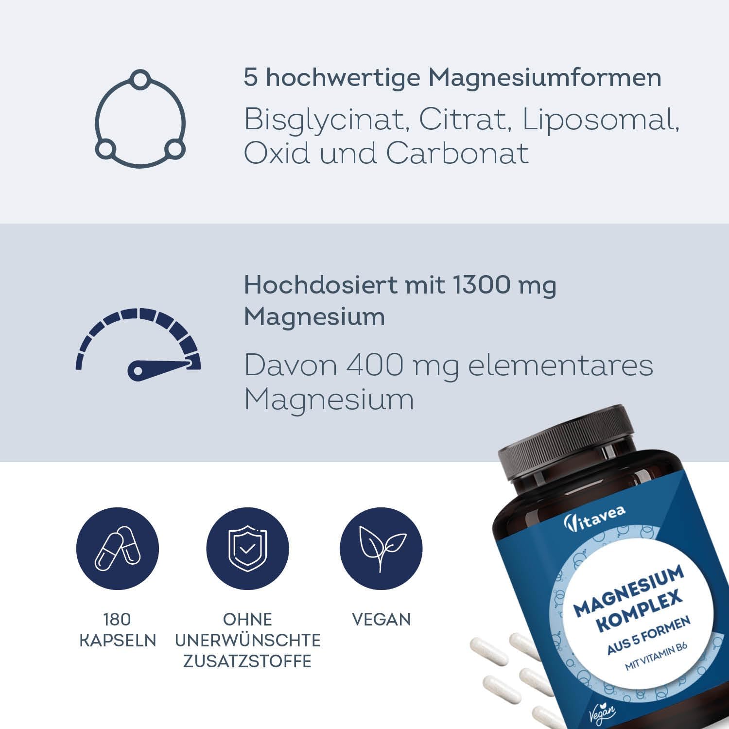 Magnesium Complex High Dose 180 Capsules – 400 mg Elementary Magnesium per Daily Dose, 5 High-Quality Forms – Magnesium Citrate, Bisglycinate, Oxide – with Vitamin B6, Vegan, Vitavea
