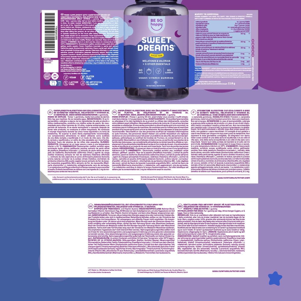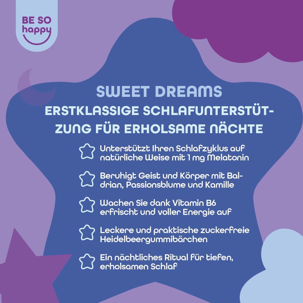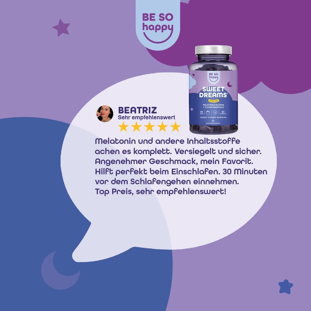 Melatonin Gummy Bears for Sleep, with Melatonin, Valerian, Passion Flower, Chamomile, Lavender and Vitamin B6, Blueberry Flavour, 60 Gummy Bears, Vegan, Gluten- and Lactose-Free, BeSoHappy®