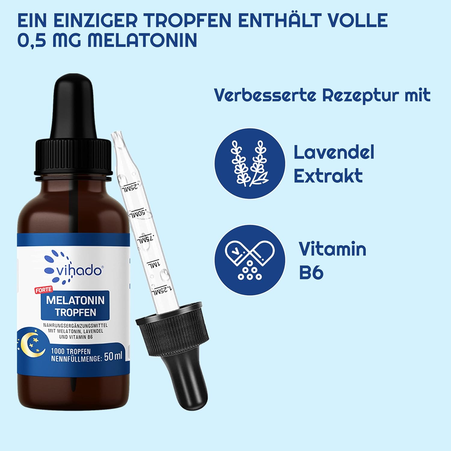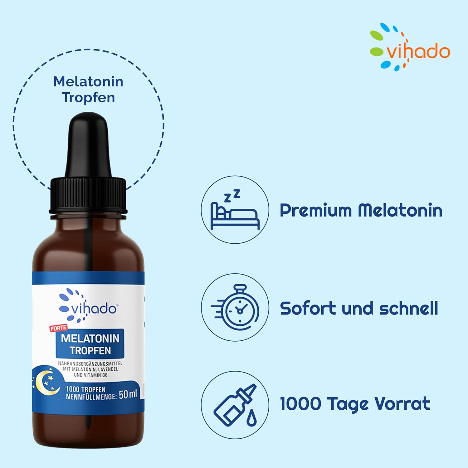 Vihado Melatonin Drops – 1000 Days – Instant and Fast – Extra High Dose (Forte) – Better Das Melatonin Complex, 50 ml (1000 Drops)